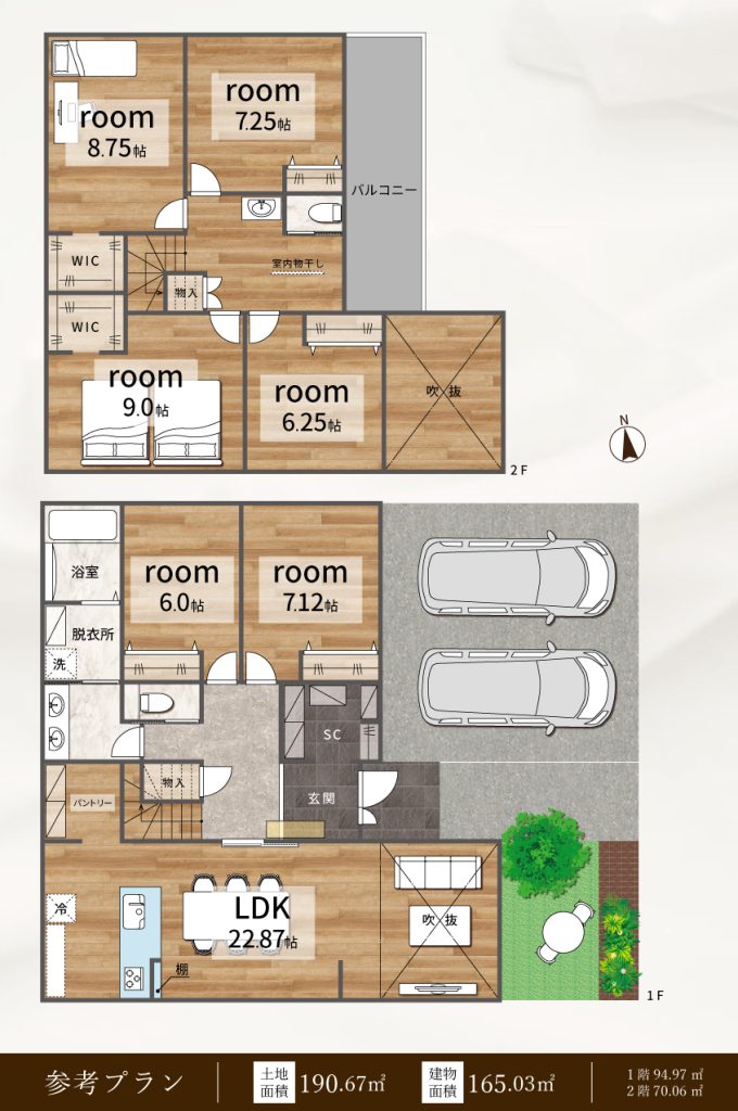 | 建物参考プラン有り | 建物参考面積:165.03㎡ 建物参考価格:4,000万(税込) 建物参考仕様:浴室乾燥機、バスルーム1坪以上、食洗機、カラーモニター付インターフォン ※参考プランは一例です。面積や構造が変更する場合があります。 |