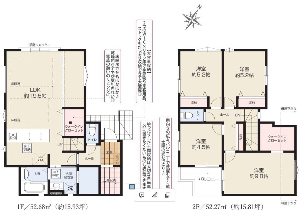 | 仕様 | 浴室乾燥機、バスルーム1坪、食洗機、カラーモニター付インターフォン、床暖房 |